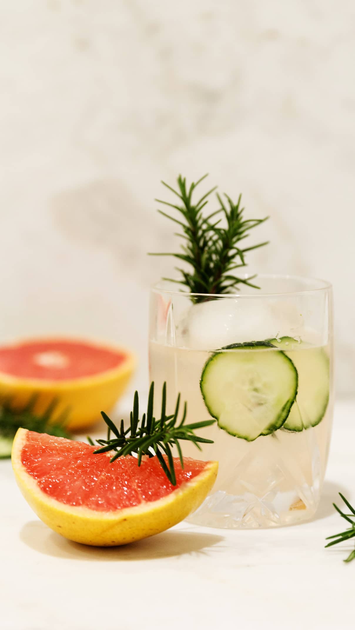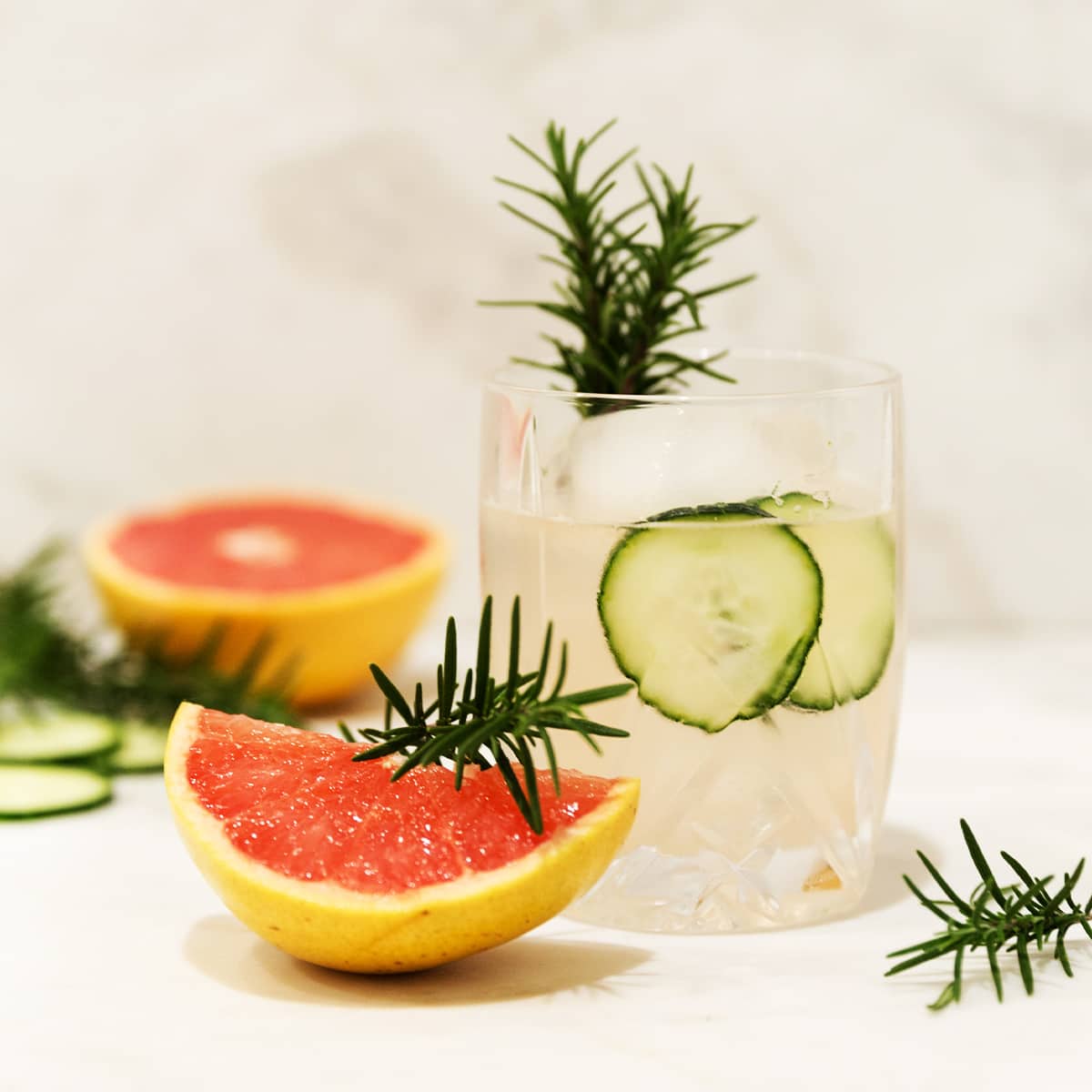 Add 1–2 thin slices of cucumber, a wedge of grapefruit, and a stiff sprig of rosemary.